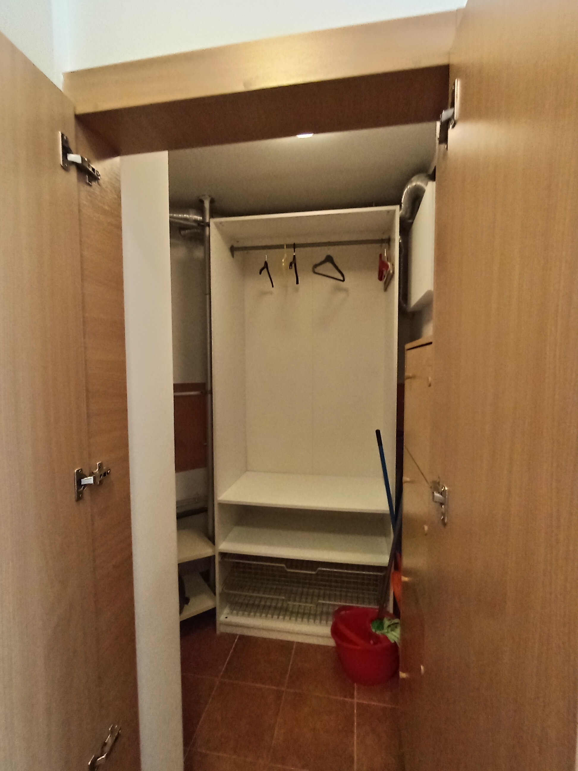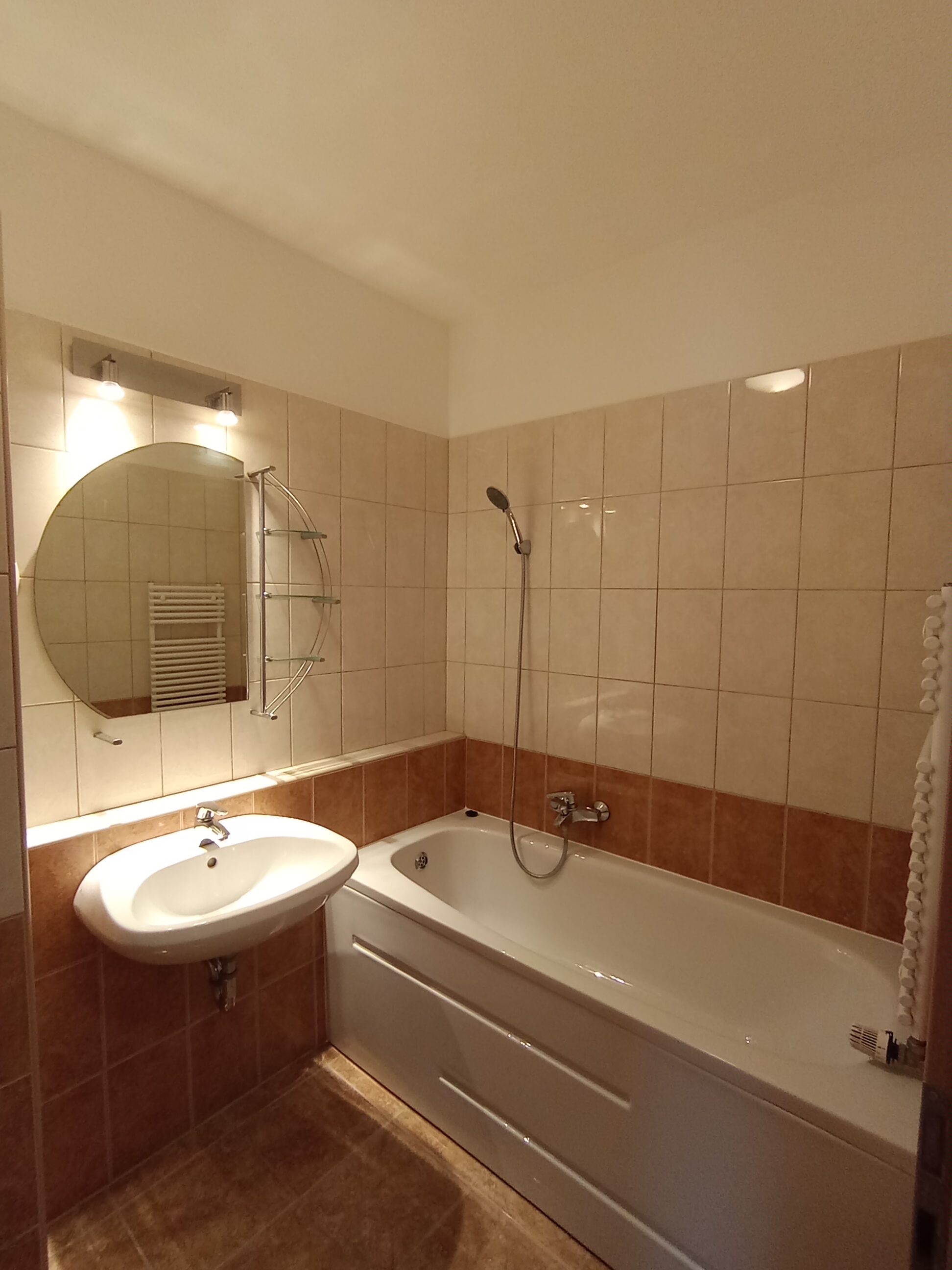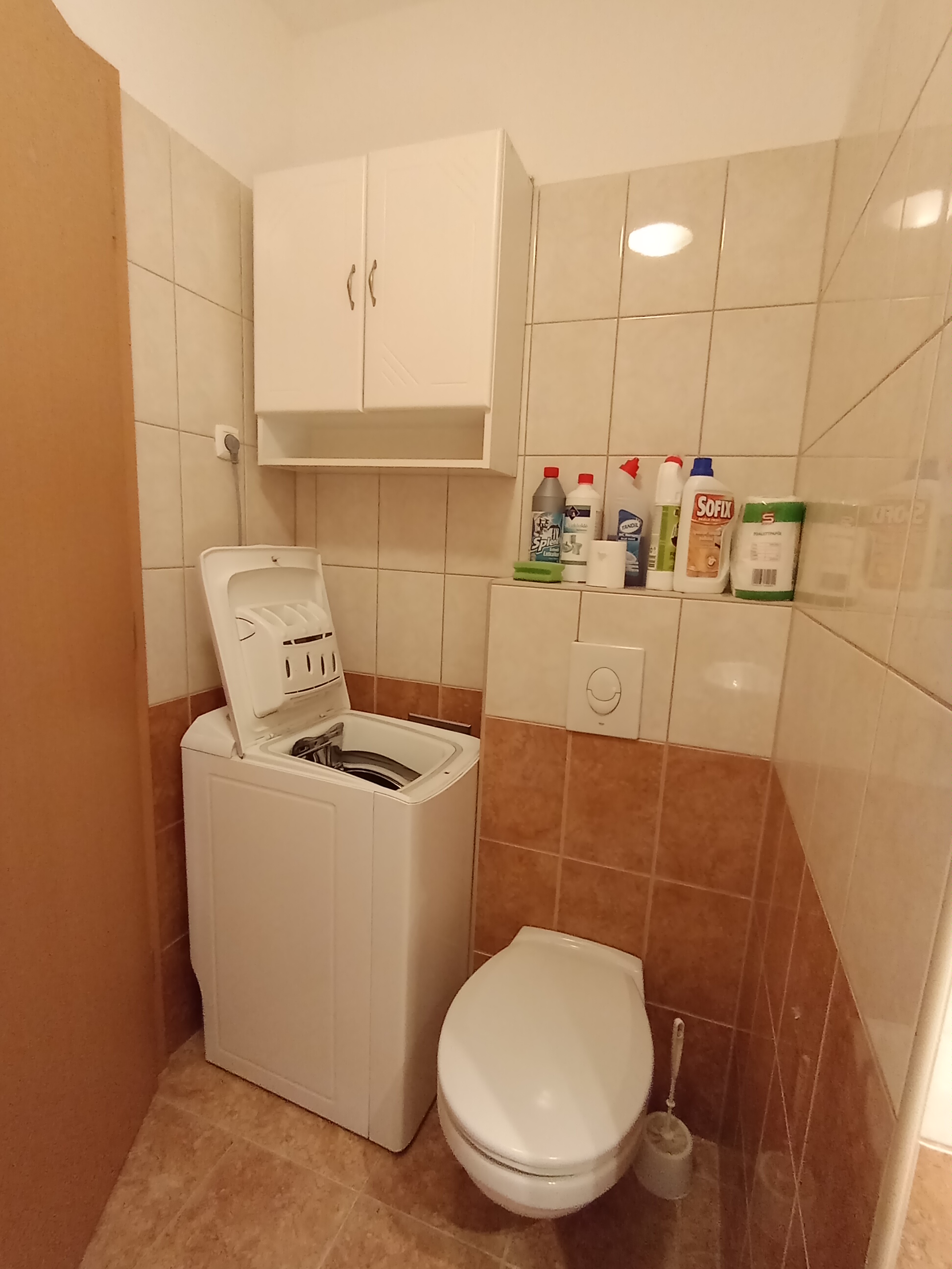 Az előszobából nyílik a kádas fürdő mosógéppel és egy kis méretű gardróbszoba.