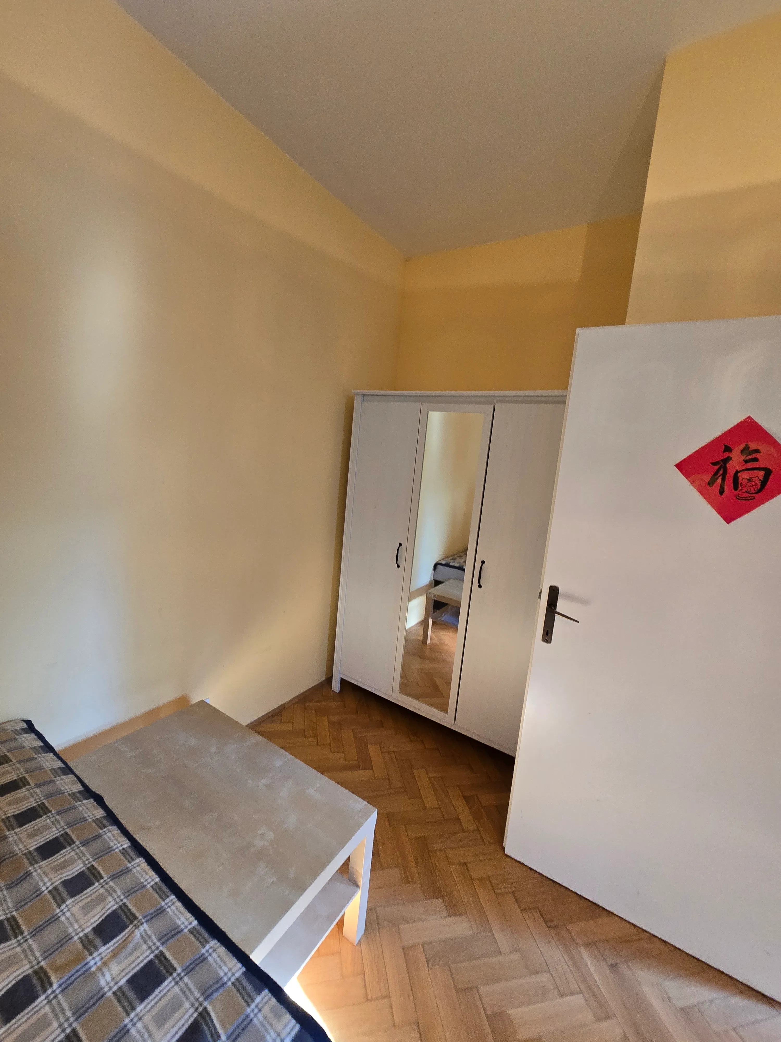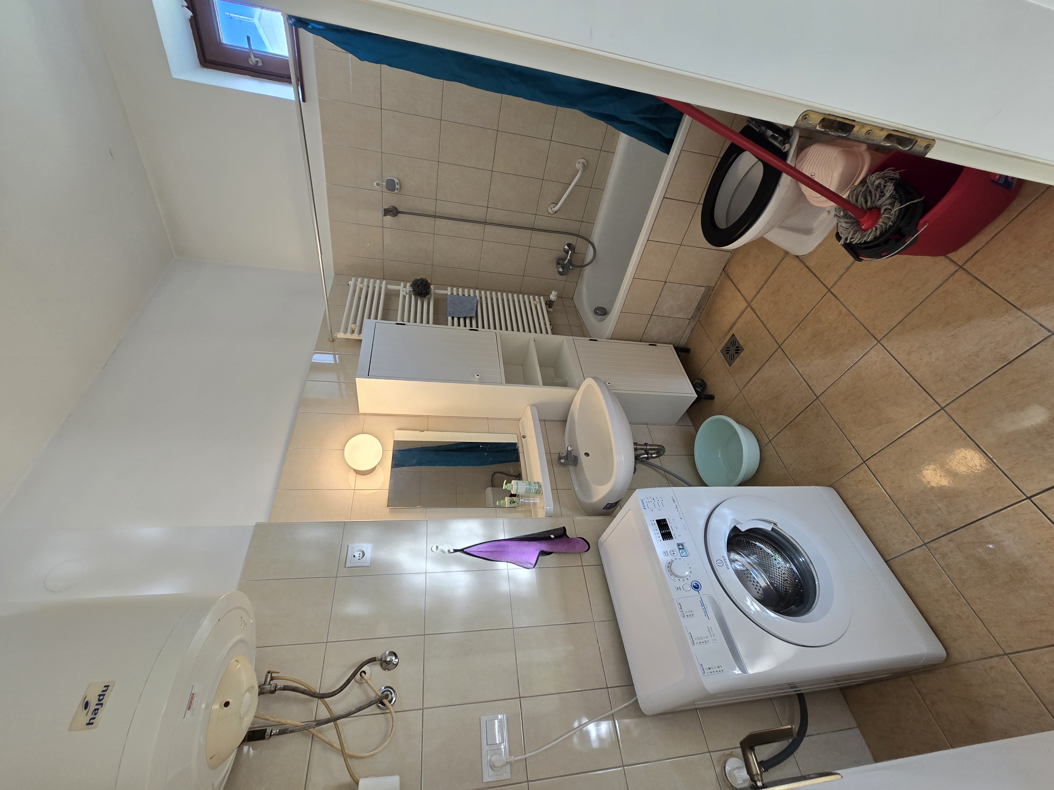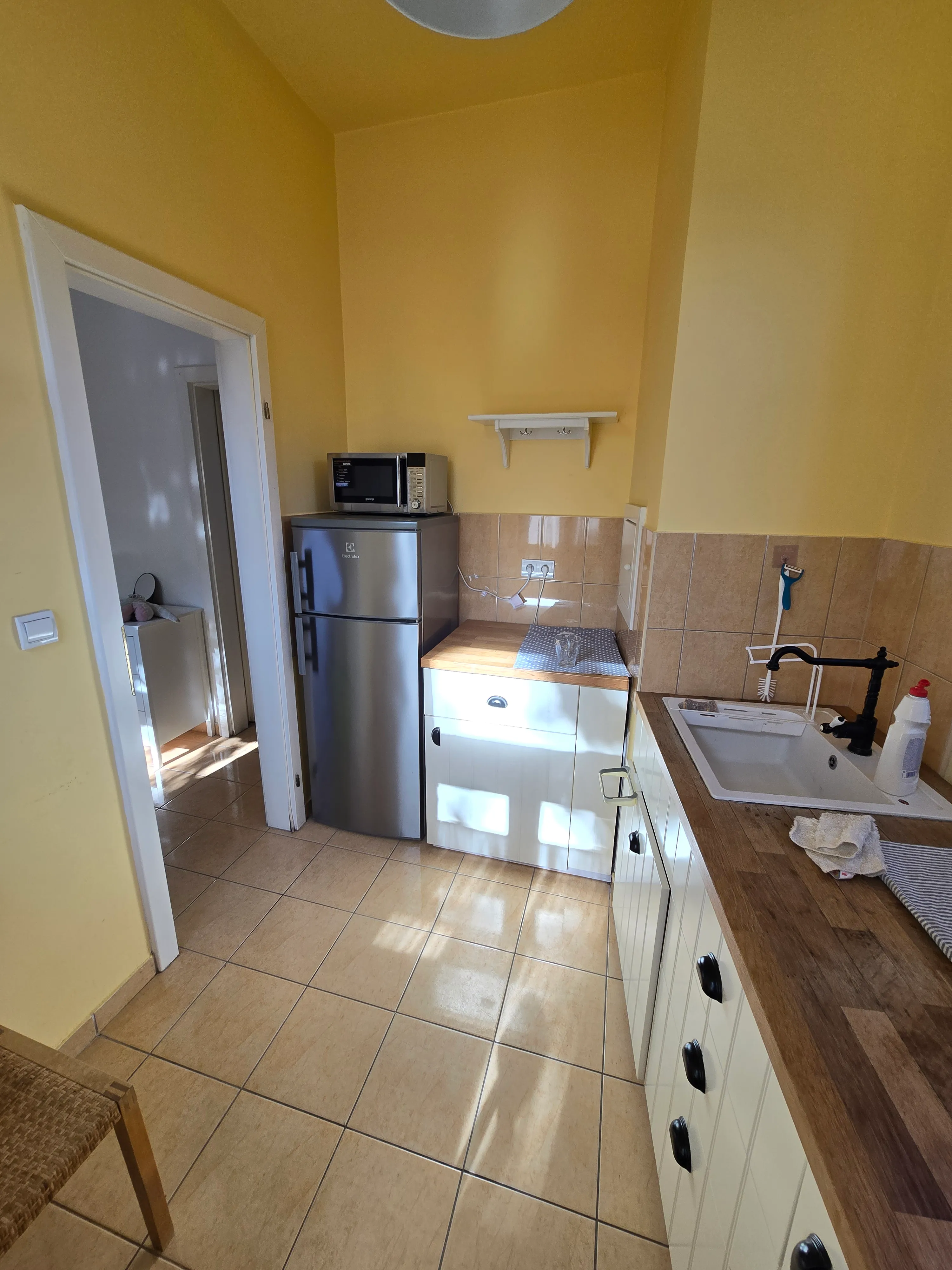 Az első emeleti lakás rendelkezik egy konyha/étkező résszel, kádas fürdőszobával és egy tágas szobával. A lakás teljesen bútorozott és gépesített (mosógép, hűtő, sütő, mosogatógép). A társasház rendelkezik egy saját belső kerttel, a környék nagyon csendes.