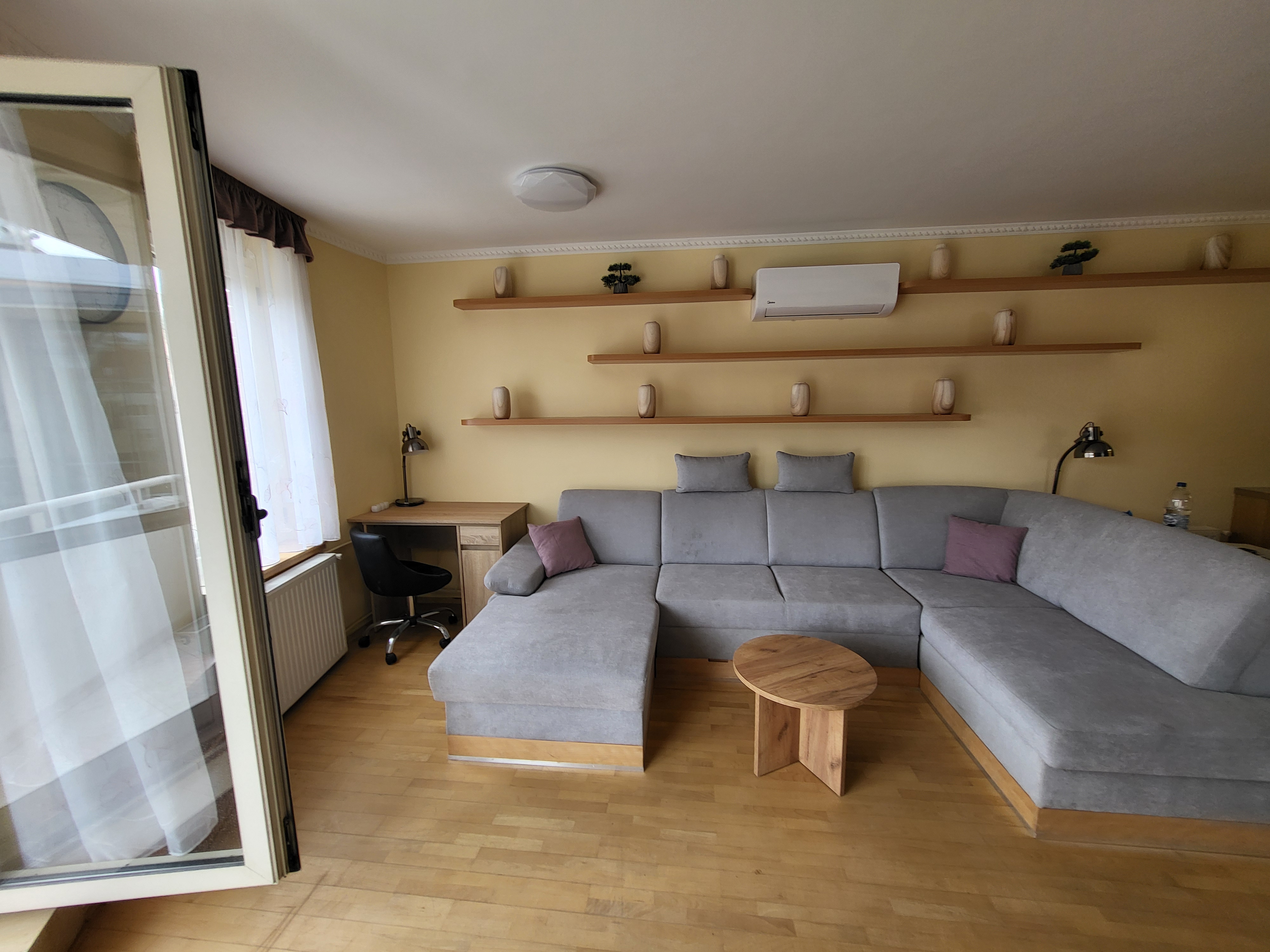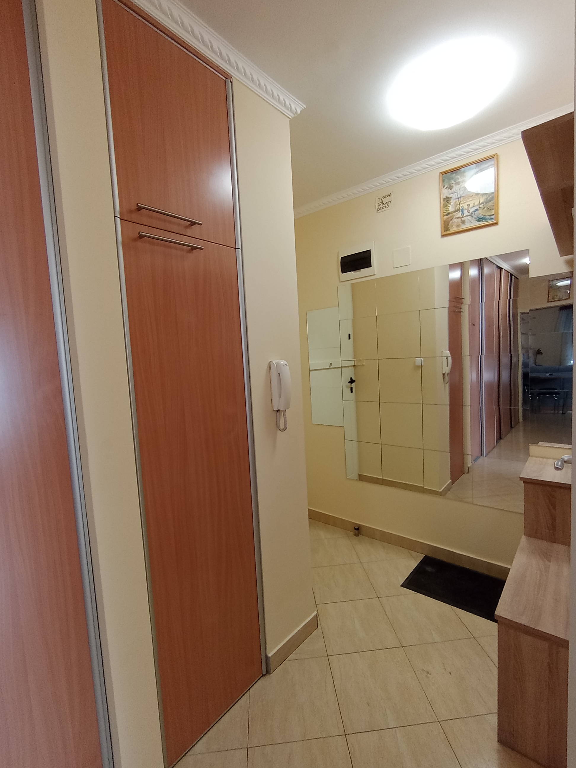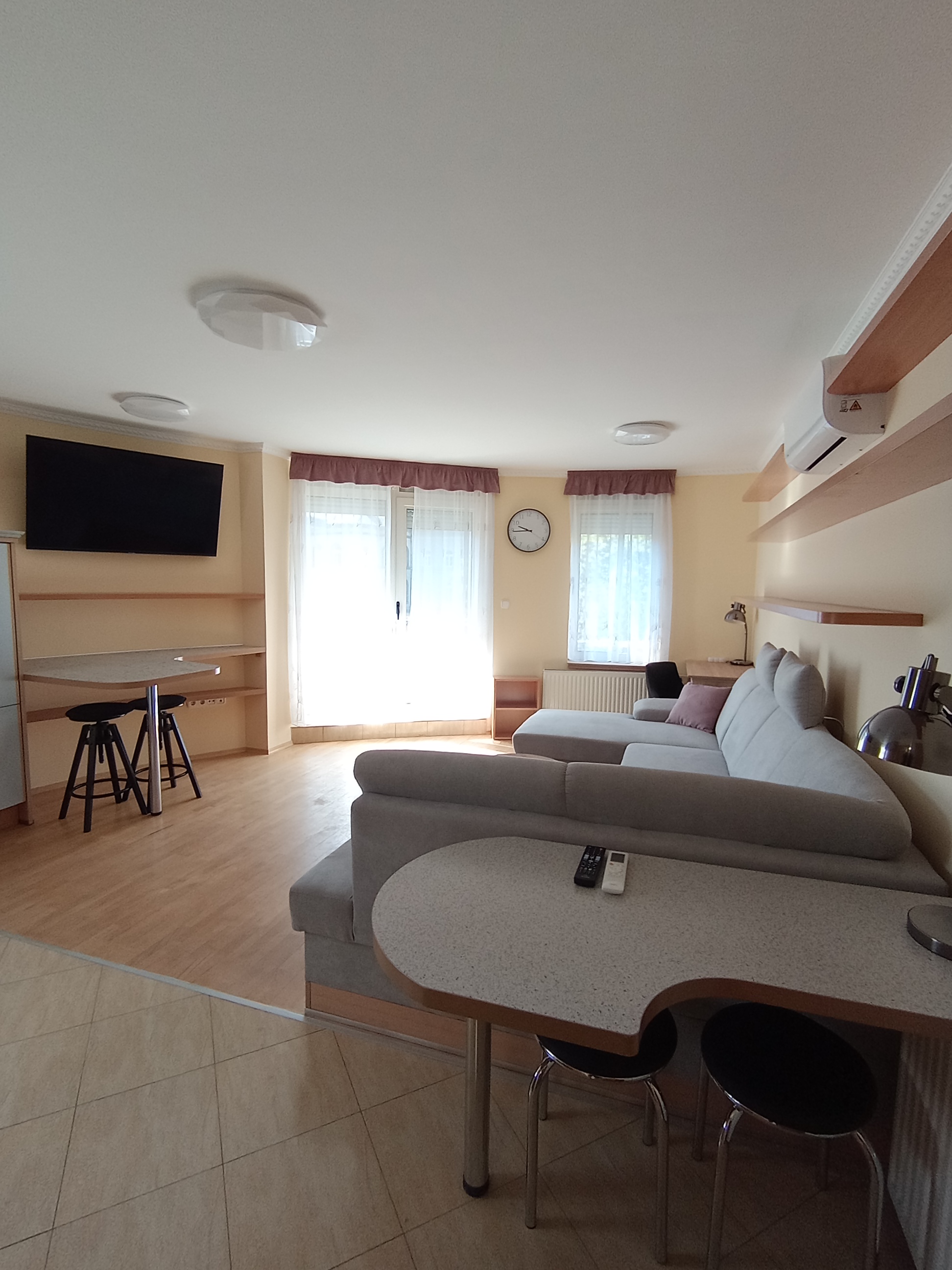 Az 52 m2-es harmadik emeleti lakáshoz tartozik egy nappali amerikai konyhával, hálószoba, kádas fürdő és 2 erkély. A lakás bútorozott, felszerelt és gépesített. Található mosógép, mosogatógép, íróasztal, főzőlap, sütő, mikró, hűtő, légkondi, TV.